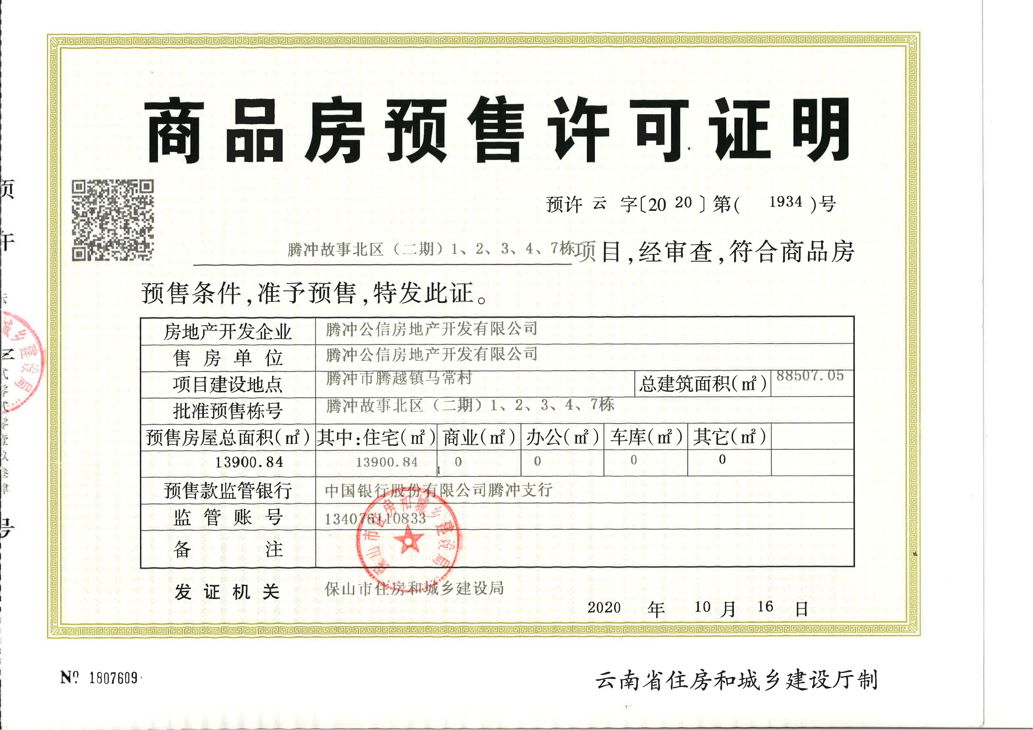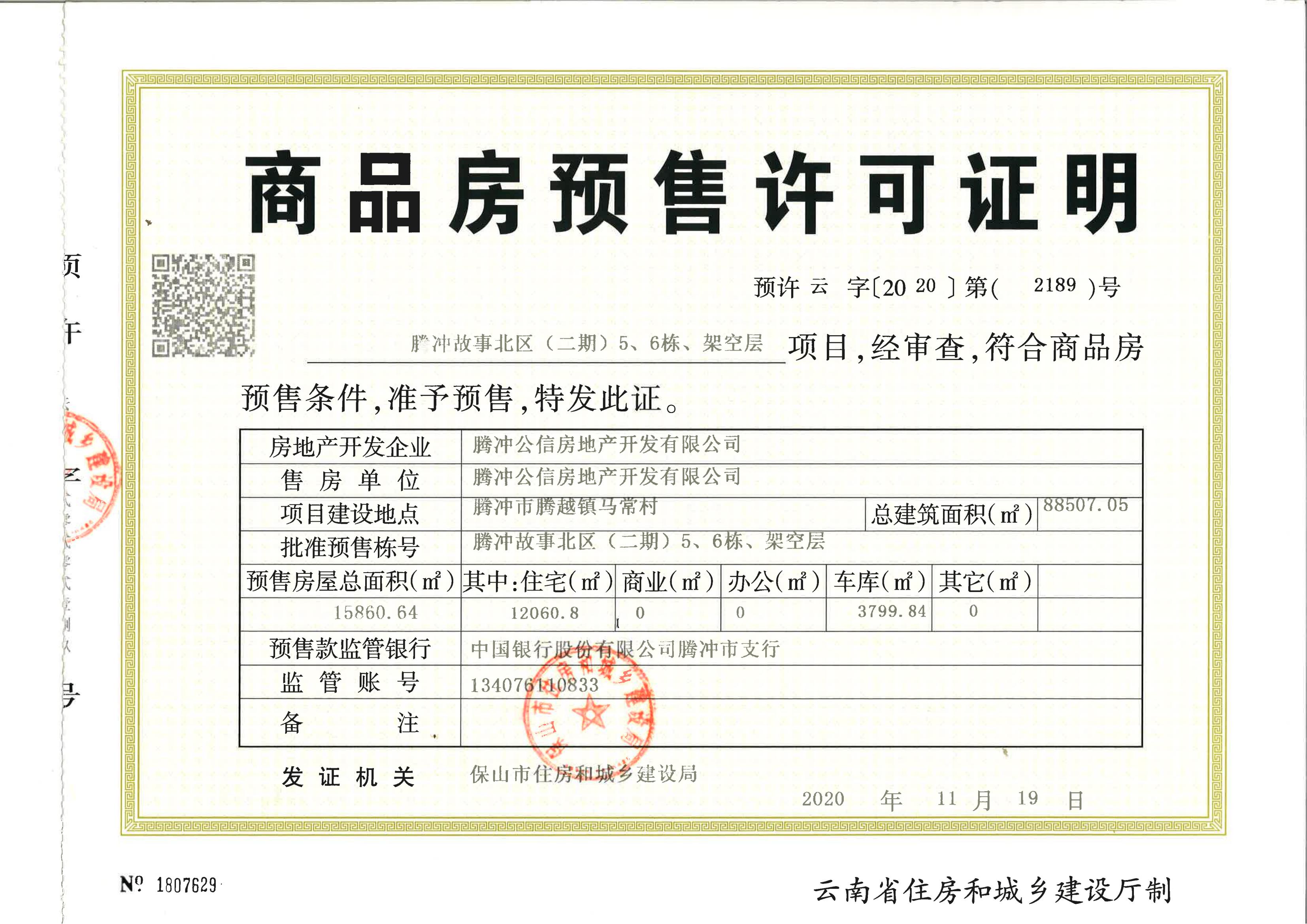 腾冲故事北区(二期)7栋7幢已获得预售许可证